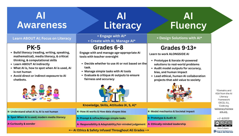 Phase 1 (Years 5-7): No direct tool use. Focus on conceptual understanding of AI systems, pattern recognition, and data literacy.